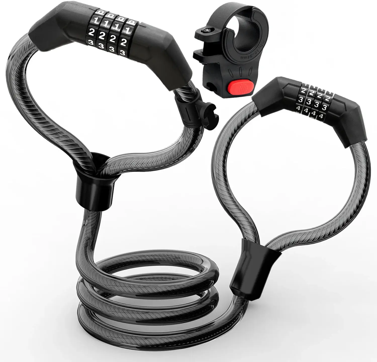 ntroducing the Dual-Core FlexiGuard, the ultimate security solution designed for modern mobility. This innovative cable lock redefines anti-theft protection with its unique dual-head locking mechanism, offering unparalleled flexibility and safeguarding for your bicycles, electric scooters, and other valuable equipment. Constructed with a robust 12mm galvanized steel cable, coated in durable PVC, it resists cutting attempts while protecting your items from scratches. The dual-core design allows you to secure both ends independently to your vehicle and a fixed object, or even to multiple items simultaneously, providing a more comprehensive locking strategy than conventional single-headed locks. Enjoy key-free convenience with the easy-to-set 4-digit resettable combination, ensuring quick access for you and impenetrable security against others. Its smart coiled design allows for compact storage, and with an included mounting bracket, you can effortlessly attach it to your ride, making security both steadfast and accessible.