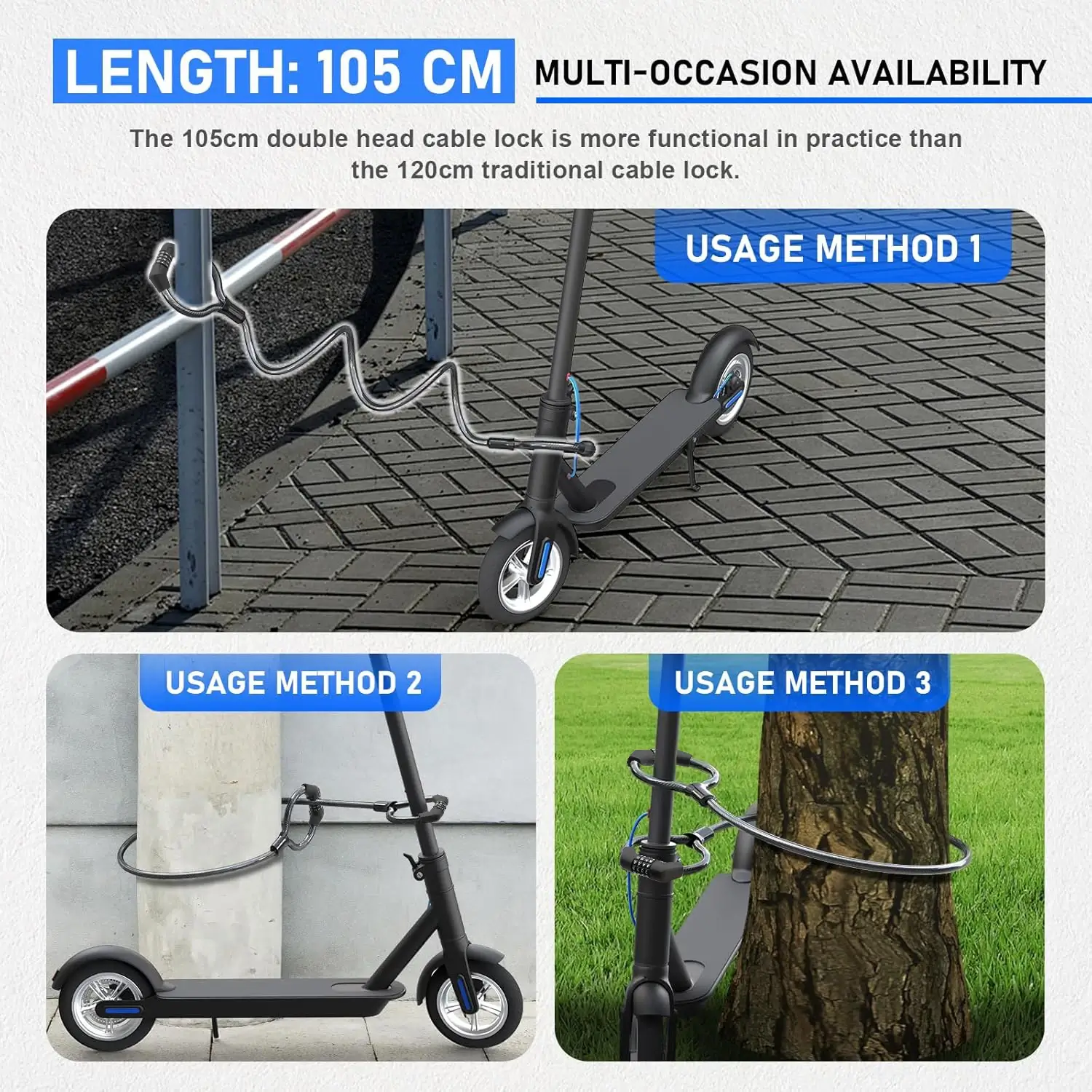 Usage: Electric scooters, bicycles, children’s scooters, gates, sports equipment, toolboxes, general purpose anti-theft.